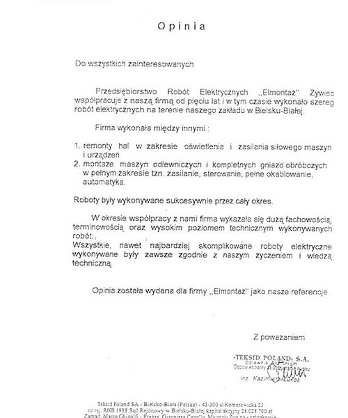 | Teksid Poland - montaż oświetlenia 20 centrów obróbczych wraz z całą instalacją sterowników komputerowych i wizualnych. |