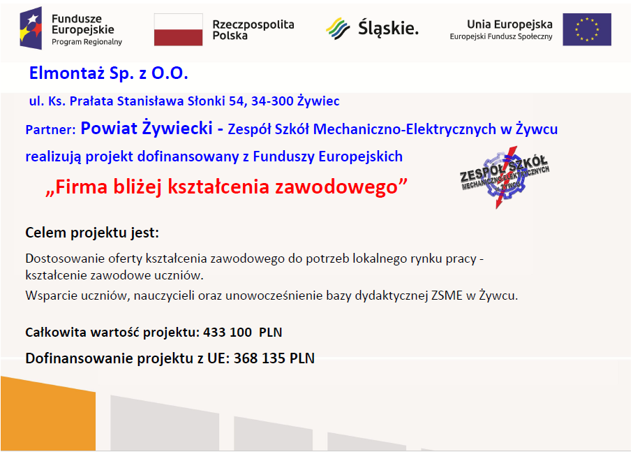 Od września 2016 r. do października 2017 r. Firma Elmontaż wraz z Zespołem Szkół Mechaniczno – Elektrycznych w Żywcu zrealizowała Projekt RPSL.11.02.03-24-02C4/16 „Firma bliżej szkoły”.