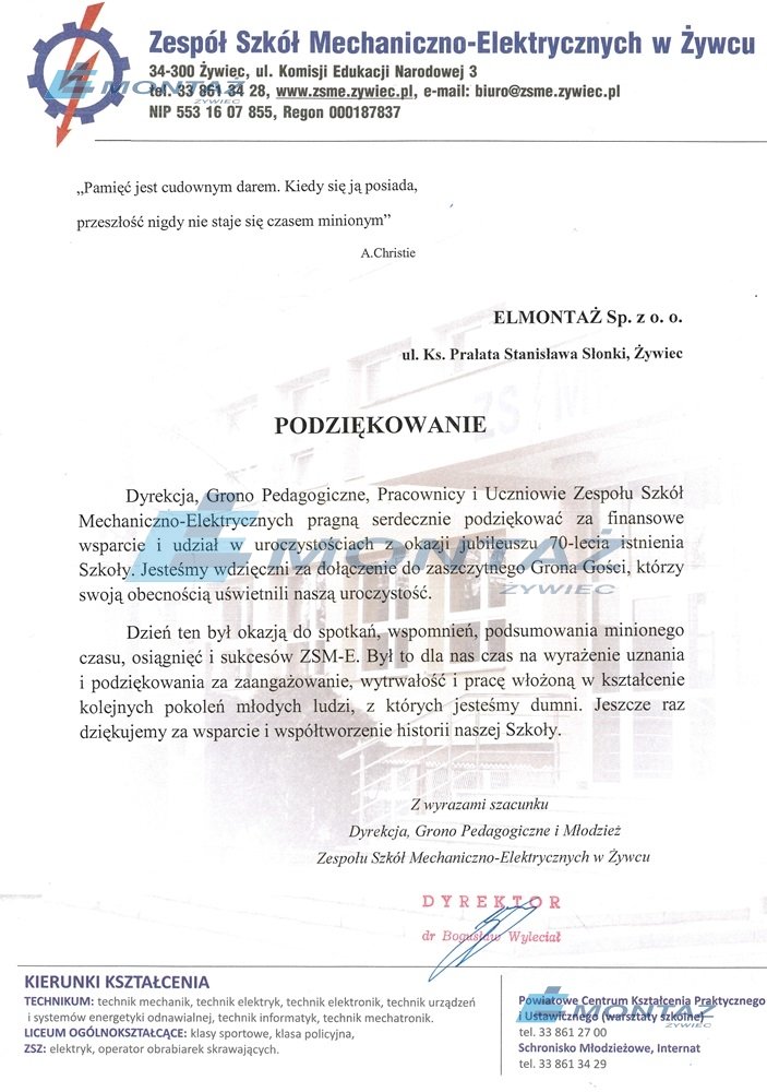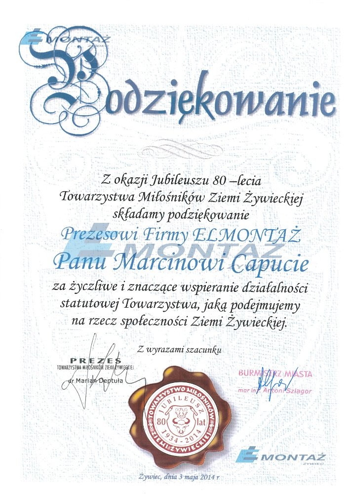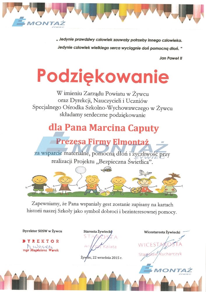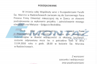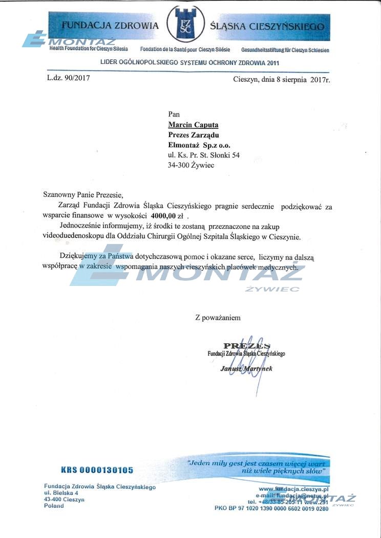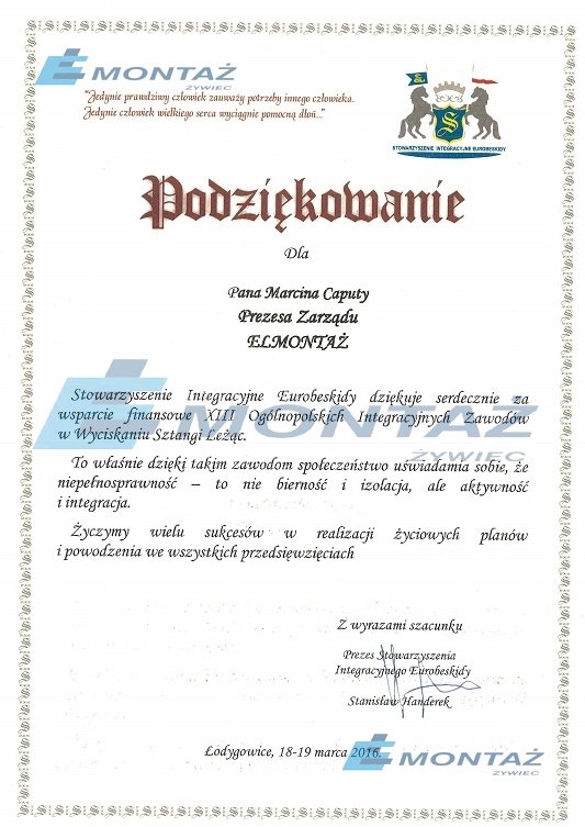Elmontaż Sp. z o.o. od lat angażuje się w działalność prospołeczną i charytatywną. Z dbałością i troską reagujemy na problemy potrzebujących, dlatego też każdego roku staramy się odpowiadać na prośby jakie otrzymujemy, przede wszystkim z lokalnych środowisk. Wspieramy wiele inicjatyw, w głównej mierze dotyczące dzieci i młodzieży.